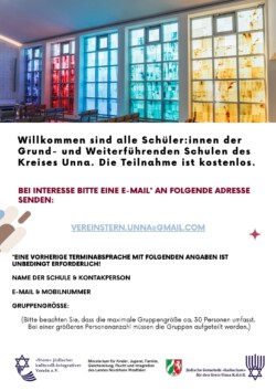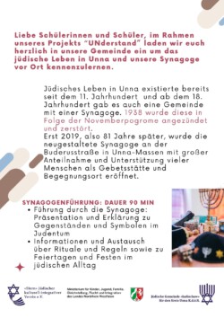 Im Rahmen unseres Projekts “UNderstand!” laden wir euch herzlich in unsere Gemeinde ein, um das jüdische Leben in Unna und unsere Synagoge vor Ort kennenzulernen.
